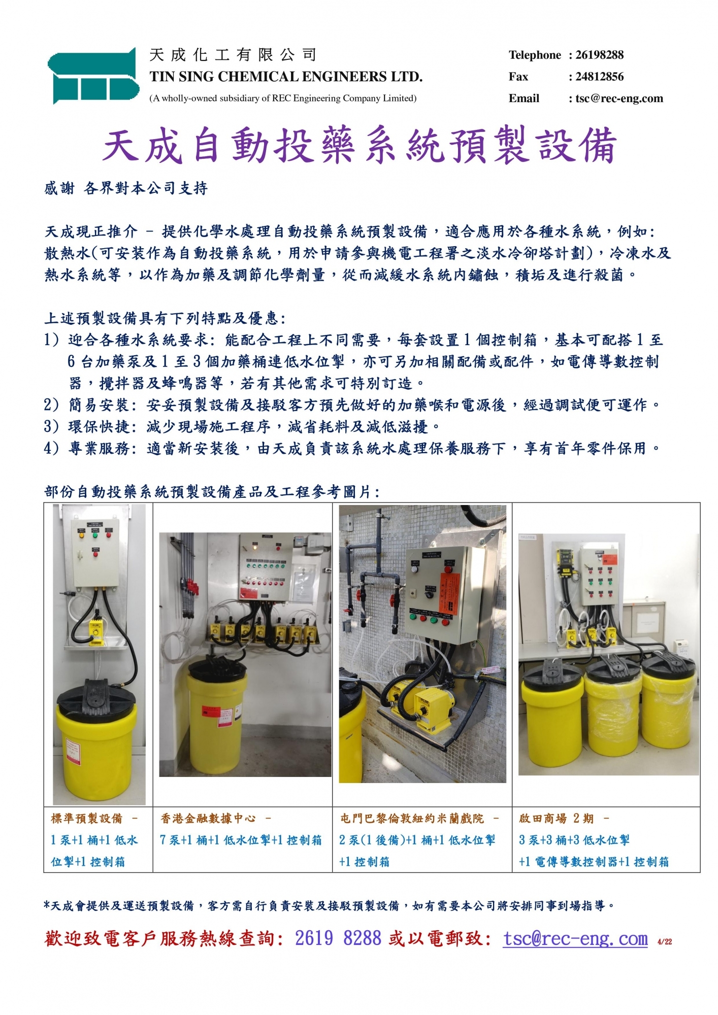 化学水处理 冷却水系统处理 冷热水系统处理 泳池水系统处理 食水系统处理 锅炉水系统处理 污水系统处理 提供在缐化学品/氧化还原电位(ORP)实时监控,加药和警报系统 其他服务 各水质化验 各水系统及水质监察 冷却水塔消毒及清洁 冷却塔系统年度独立审核 化学剂销售 冷却塔系统独立审核报告 提供自动投药系统预制设备 铜和银离子化系统 铜和银离子化系统适用于控制冷却塔系统中的退伍军人桿菌